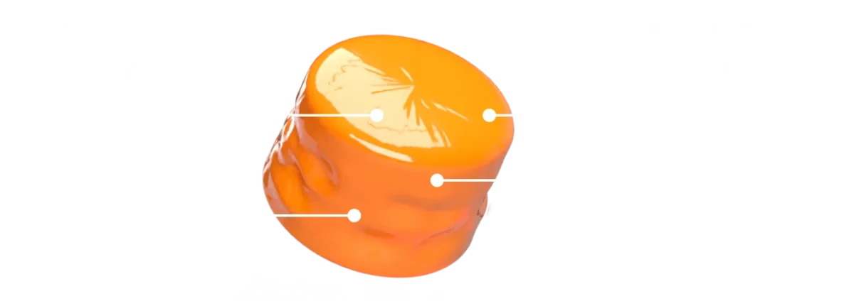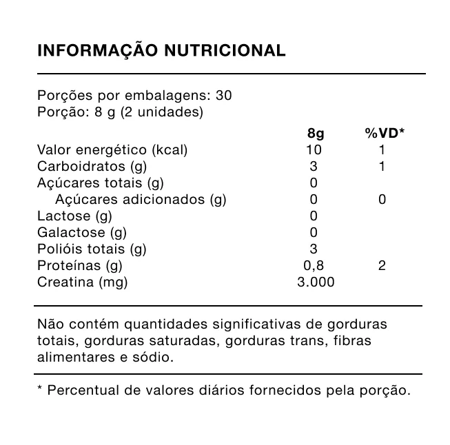 Ingredientes: Creatina monohidratada, agentes de massa maltitol e sorbitol, gelificante gelatina, acidulantes ácido cítrico e ácido lático,  aroma natural de laranja, glaceante cera de carnaúba, triglicerídeos de cadeia média, conservante sorbato de potássio, corante natural de curcumina, edulcorante sucralose e sequestrante EDTA dissódico.
